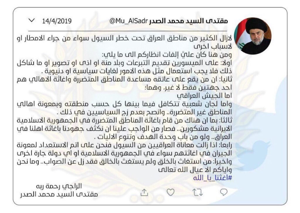 واکنش «مقتدی صدر» به امدادرسانی نیروهای عراقی به سیل زدگان در ایران + متن توئیت