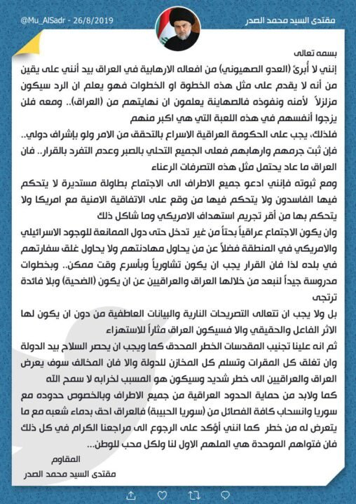 وی در این پیام توییتری آورده است: من دشمن صهیونیستی را از اقدامات تروریستی‌اش در عراق تبرئه نمی کنم اما یقین دارم که این دشمن دست به چنین اقدام یا اقداماتی نمی زند چرا که می داند پاسخ عراق، امنیت و نفوذ آن را متزلزل می کند. صهیونیست ها می دانند که پایان کارشان از عراق خواهد بود. با این وجود، اسرائیل خود را در چنین بازی که بیشتر از ظرفیت آن است، وارد نمی کند.