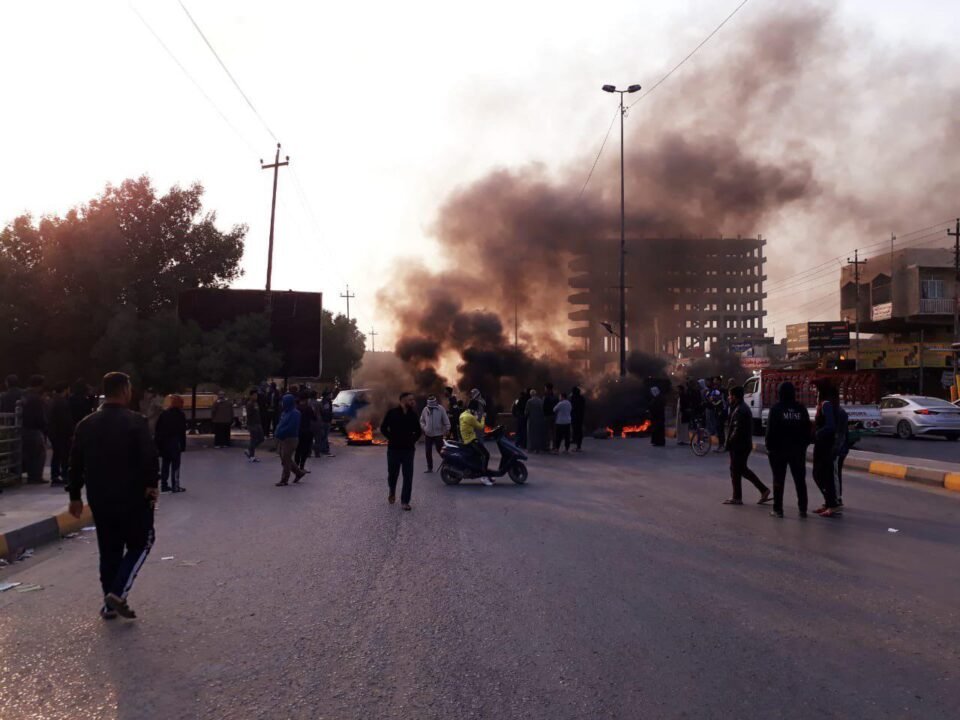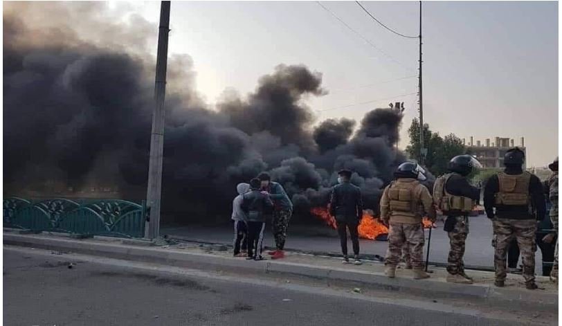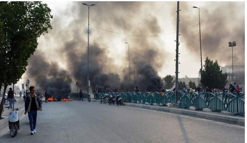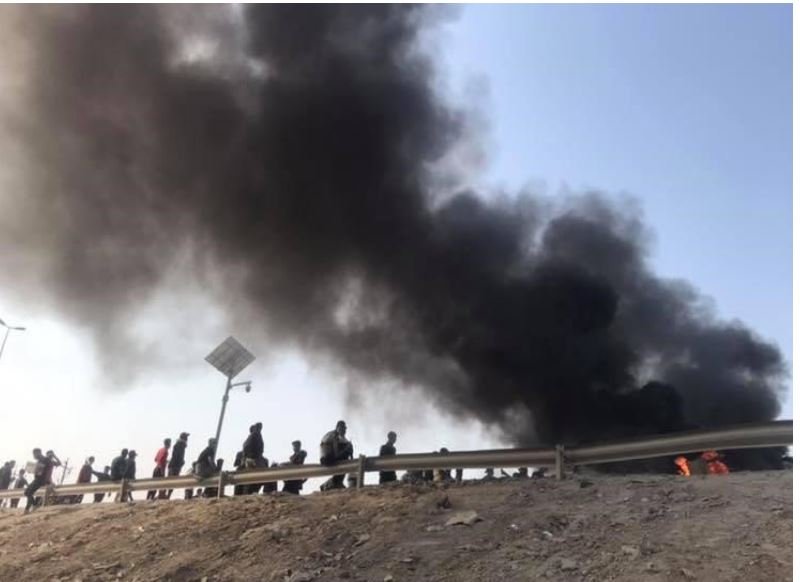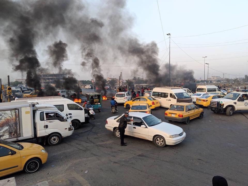 تظاهراتکنندگان در شهرهای کربلا، بغداد، بابل، نجف و شماری از شهرهای عراق با آتش زدن لاستیک خودروها اقدام به بستن خیابانها کردند.