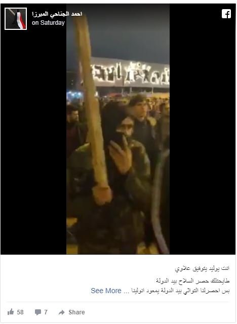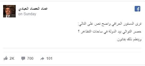 در همین رابطه، «عماد العبادی»، از فعالان رسانه‌ای در صفحه شخصی خود در فیسبوک، با تمسخر قانون اساسی عراق و کنایه زدن به طرفداران صدر، نوشت: «التواثی (چماق‌های معروف در عراق) باید در دستان دولت منحصر باشد!»