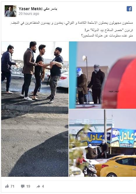 «یاسر مکی»، دیگر فعال اجتماعی عراقی با انتقاد از حضور و گسترش افراد مسلح برای متفرق کردن تظاهرات نجف اشرف، نوشت: «افراد مسلح ناشناس که سلاح‌های صدای خفه‌کن به دست دارند، تظاهرات‌کنندگان را تهدید کرده و به آنان حمله می کنند. می‌خواهید سلاح را در دست دولت منحصر کنید؟ چه کسی اطلاعاتی درباره این افراد مسلح در دست دارد؟»