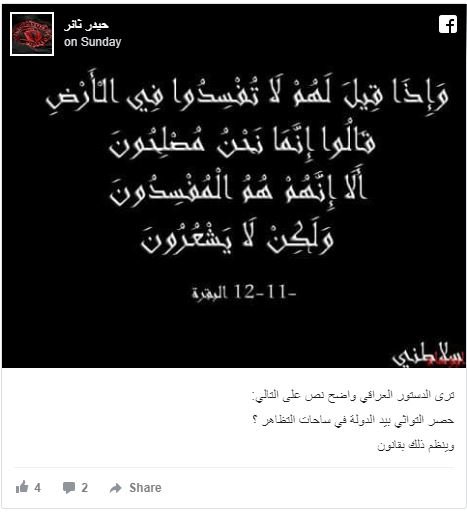 «حسن ثائر»، دیگر معترض عراقی با شاهد آوردن آیه قرآنی و در کنایه به کلاه‌آبی‌های وابسته به جریان صدر نوشت: «اگر به برخی گفته شود، در زمین فساد به پا نکنید، جواب می دهند تنها ما اصلاح‌گران هستیم اما آنها متوجه نمی شوند.»