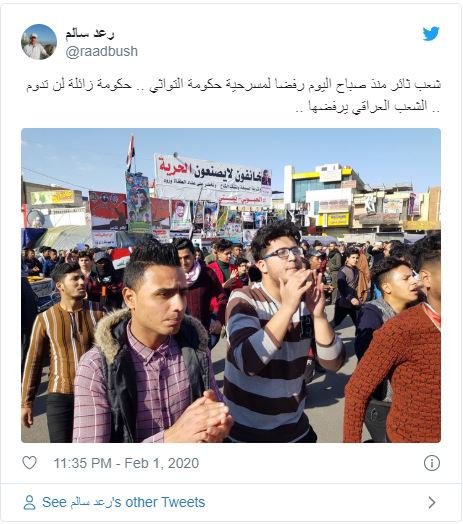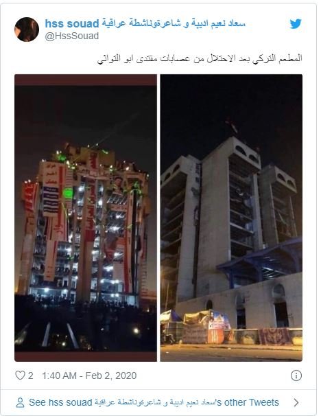 در پایان «مریم هاشم» از فعالان شبکه‌های اجتماعی با انتقاد از تلاش‌های هواداران رهبر جریان صدر برای دزدیدن انتفاضه مردم عراق با بکارگیری خشونت و زور، نوشت: «پس از تسلط طرفداران صدر بر میدان التحریر، تاریکی بر رستوران ترکی خیمه افکنده است.»