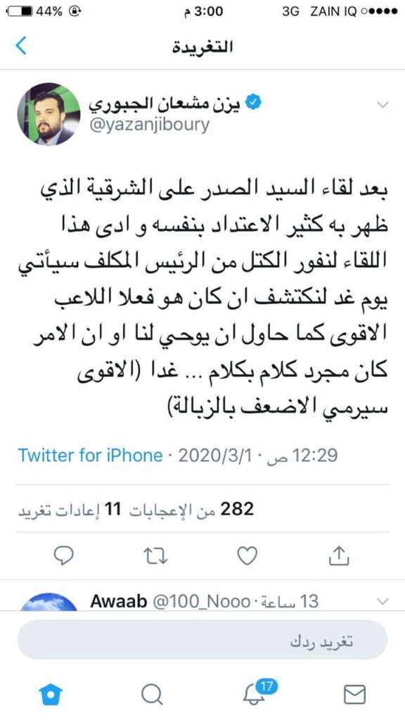 میدل ایست نیوز: «یزن مشعان الجبوری»، پسر مشعاون الجبوری، یکی از چهره های بارز اهل تسنن در واکنش به مصاحبه «سید مقتدی صدر» با شبکه خبری «الشرقیه» در حساب توئیتر خود نوشت که در پارلمان به وی نشان خواهیم داد که قدرت چه کسی از همه بیشتر است.