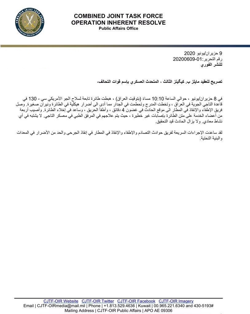 براساس این بیانیه، «مایلز کیگنز»، سخنگوی نظامی ائتلاف بین المللی، تأکید کرده که در ساعت 22:10 دقیقه (به وقت بغداد) در روز 8 ژوئن یک هواپیمای C-130 تابع نیروی هوایی ایالات متحده در حین فرود در پایگاه نظامی التاجی با خارج شدن از باند به دیواره ساختمان اصابت کرد.