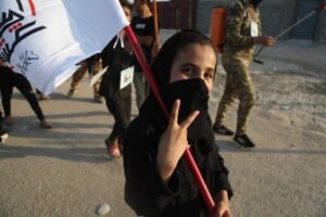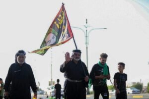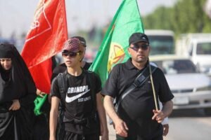 گروهی از عزاداران حسینی، پیش از آغاز مراسم اربعین، از بصره به کربلا پیاده روی می کنند.