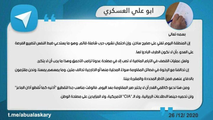 العسکری در توئیتی که در بامداد یکشنبه (27 دسامبر) منتشر کرده نوشت: «منطقه امروز در حالتی ملتهب است و احتمال درگرفتن جنگ فراگیر در میان است و برای همین باید با خویشتنداری فرصت را از دشمن بگیریم و ما آغازگر جنگ نباشیم».