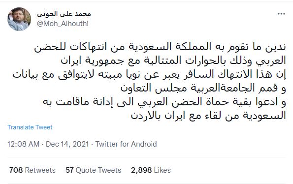 وی روز گذشته با انتشار توئیتی در واکنش به این مذاکرات گفت: اقدام عربستان در خروج از چارچوب و آغوش کشورهای عربی و گفت وگوی متوالی با «جمهوری ایران» را محکوم می کنیم.