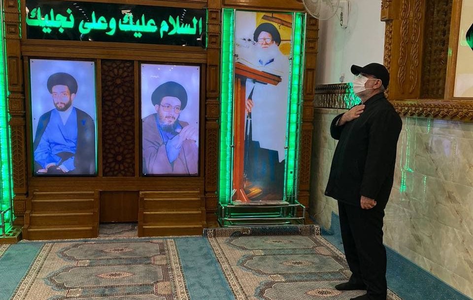 همچنین در تصاویر دیگر، فرمانده نیروی قدس سپاه در حال قرائت فاتحه در مرقد سیدمحمد صدر، پدر مقتدی صدر، در نجف اشرف دیده می شود.