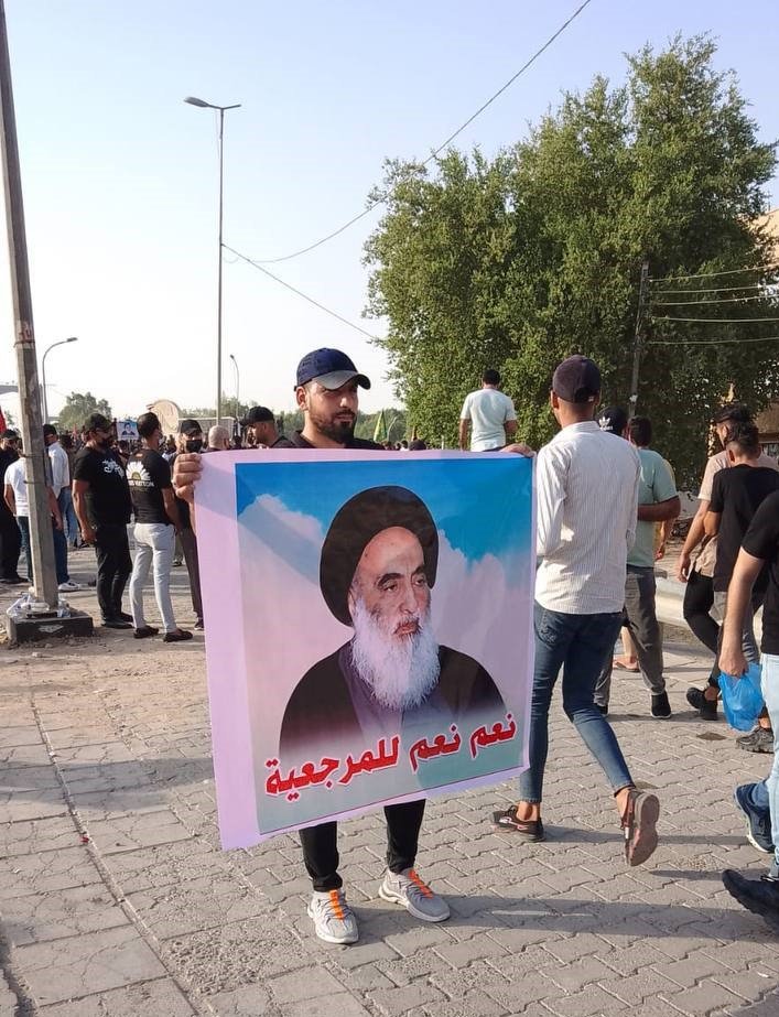 تظاهرات کنندگان شعارهای «تاج تاج علی الراس.. سید علی السیستانی»، «نعم نعم للمرجعية»، «هیهات من الذلة»، «نعم نعم للعراق.. کلا کلا للفتنة» سر دادند.
