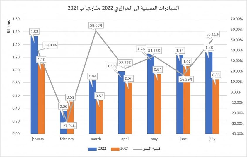 به گزارش «الفرات نیوز»، «منار العبیدی» کارشناس اقتصادی عراقی، با انتشار گزارشی تأکید کرد که صادرات چین به عراق در 7 ماه نخست سال 2021 معادل 5.8 میلیارد دلار بوده و در 7 نخست سال 2020 با 30 درصد افزایش به 7.5 میلیارد دلار رسیده است.