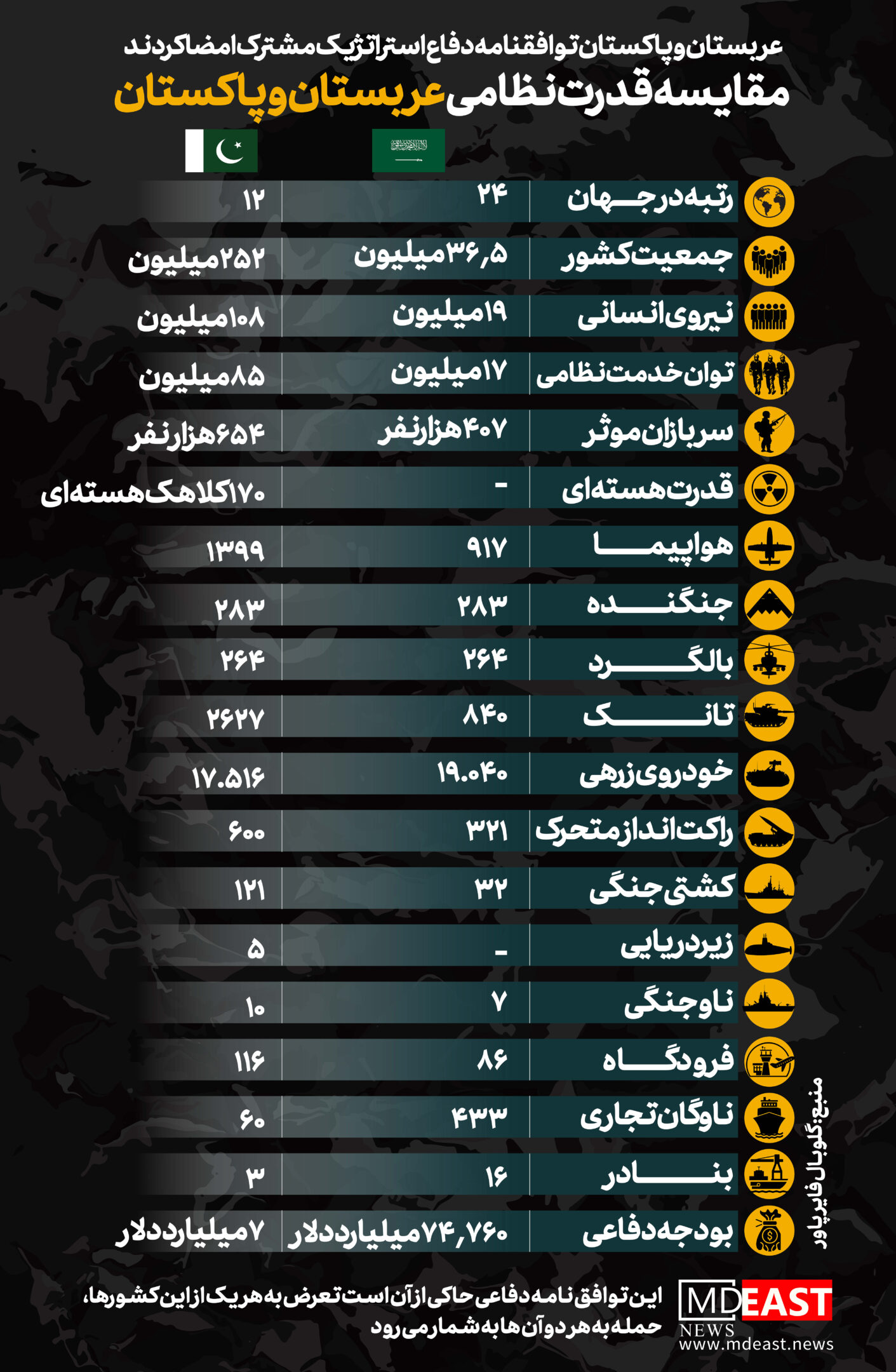 اینفوگرافیک مقایسه قدرت نظامی عربستان و پاکستان 2025-09-21 | 12:04 کپی لینک کوتاه لینک کپی شد 2025-09-21 | 12:04 اشتراک گذاری فیس بوک X لینکدین پینترست رددیت اسکایپ پیام رسان پیام رسان واتس آپ تلگرام وایبر اشتراک گذاری از طریق ایمیل چاپ
