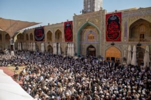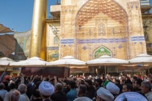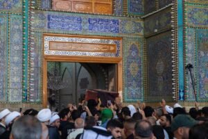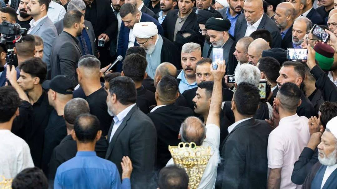 پیکر مطهر همسر حضرت آیت‌الله العظمی سیستانی، مرجع عالیقدر دینی در کربلا و نجف بر روی دستان عزاداران تشییع شد.