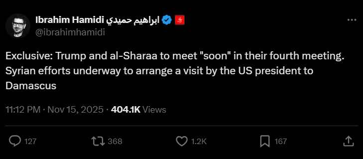 گفتنی است ترامپ و الشرع دوشنبه گذشته در کاخ سفید با یکدیگر دیدار کردند.