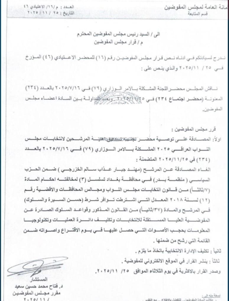 در بخشی از این صورتجلسه آمده است، هیئت کمیساریای انتخابات تصمیم گرفت تا مصوبه پیشین را که در صورتجلسه کمیته تشکیل‌شده طبق حکم وزارتی شماره (۷۹) مورخ ۱۶/۱۱/۲۰۲۵ با شماره (۲۲۴) در خصوص تأیید نامزدی مهند جبیر عذاب سلیم الخزرجی در فهرست حزب سیاسی سازمان بدر در استان بغداد با تسلسل (۳) صادر شده بود، لغو کند.