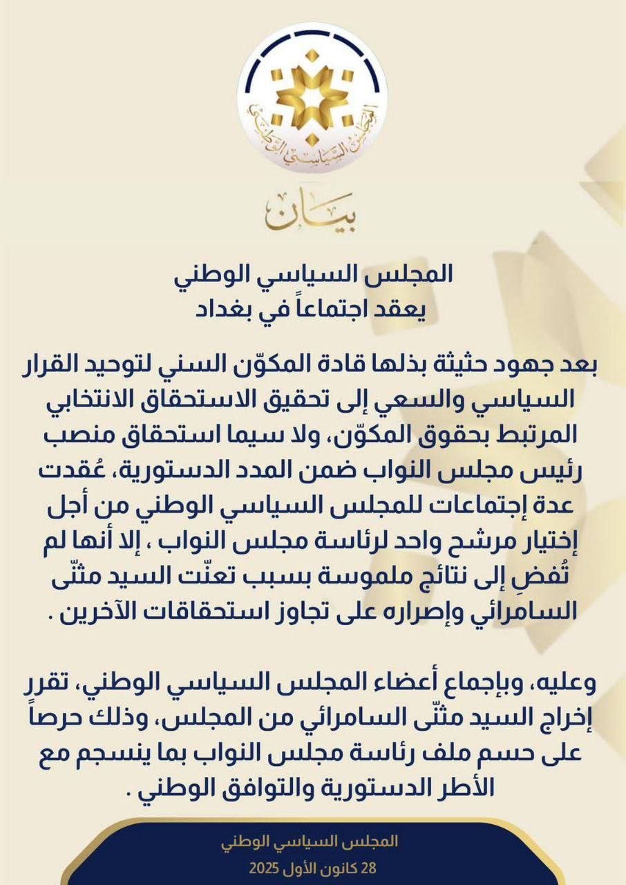 در این بیانیه آمده است که از این رو و با اجماع اعضای شورای، السامرائی از این شورا اخراج شد.