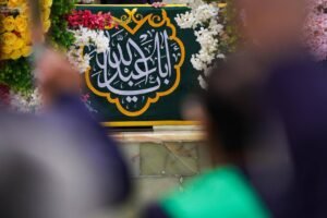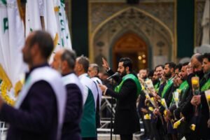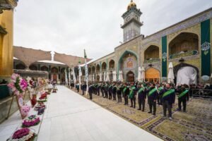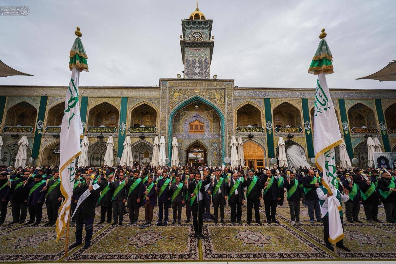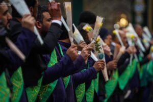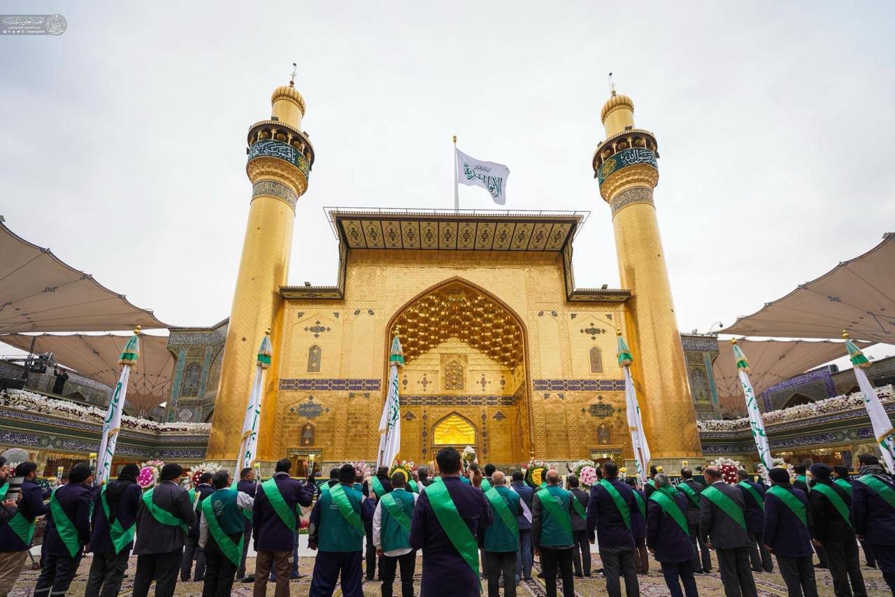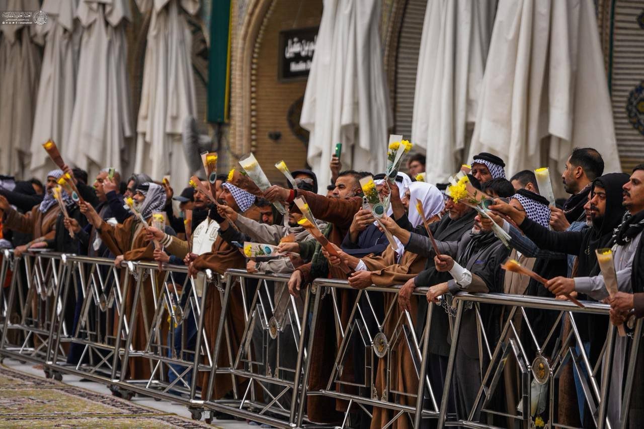 خادمان حرم مطهر امیرالمؤمنین علی(ع) در روز ولادت امام حسین(ع) فرزند ایشان، با خواندن سرودهای خاص و اهدای گل به زائران این مناسبت را جشن گرفتند.