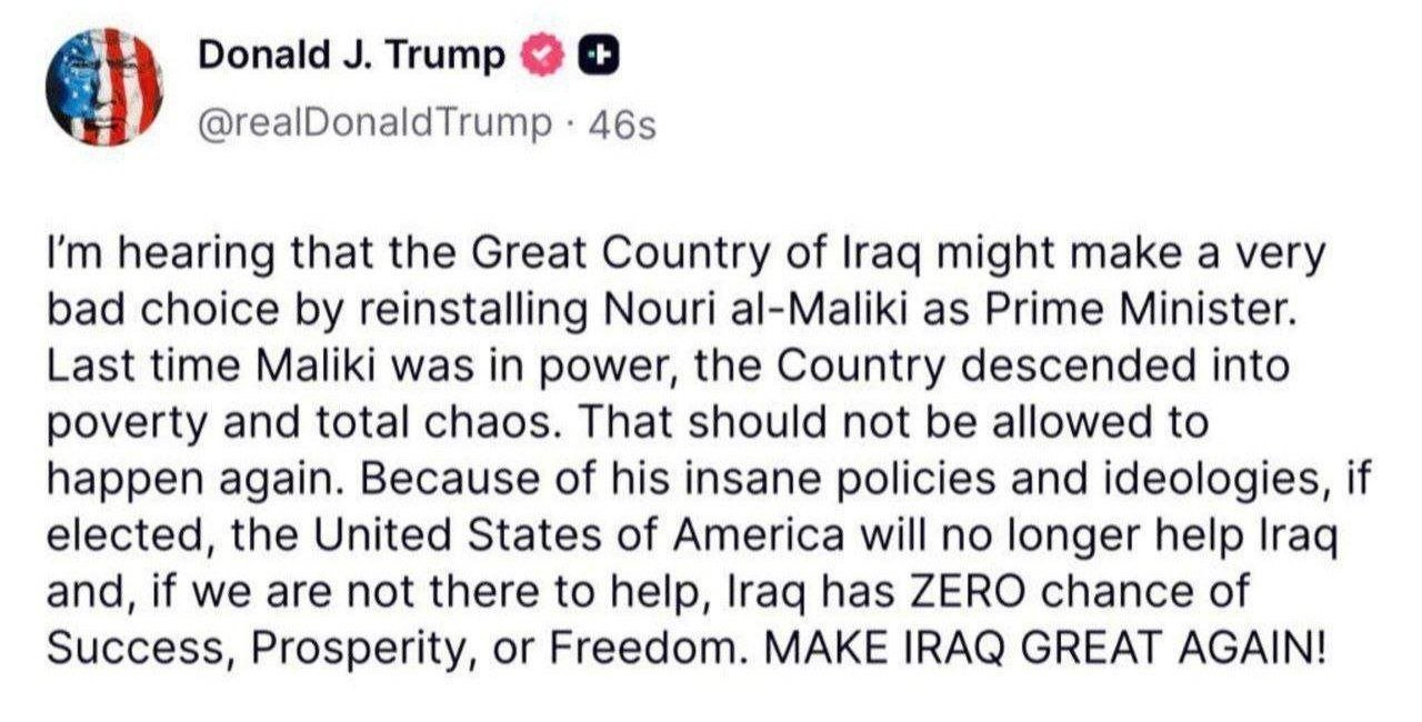 میدل ایست نیوز: دونالد ترامپ رئیس جمهور امریکا با دخالت آشکار در امور داخلی عراق در تروث سوشال نوشت: شنیدهام که کشور بزرگ عراق ممکن است با بازگرداندن نوری المالکی به مقام نخستوزیری انتخاب بسیار بدی انجام دهد. آخرین بار که المالکی در قدرت بود، کشور به فقر و آشوب کامل فرو رفت. این نباید دوباره اتفاق بیفتد.