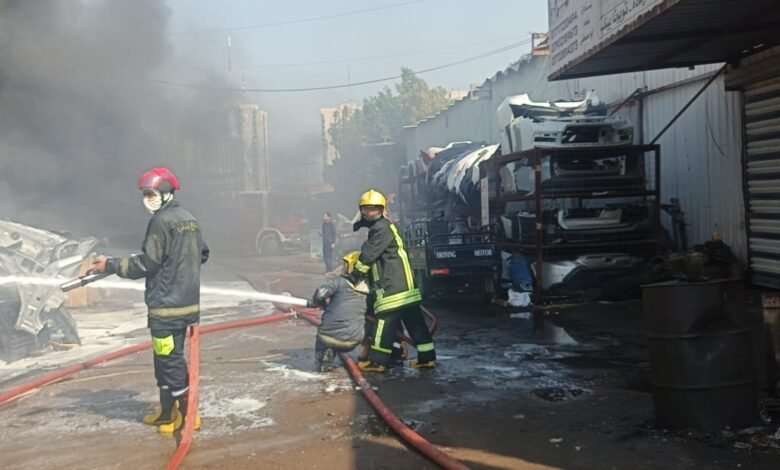 تیم‌های آتش‌نشانی، آتش‌سوزی گسترده در یک تعمیرگاه خودرو در منطقه العلاوی بغداد را مهار کردند.
