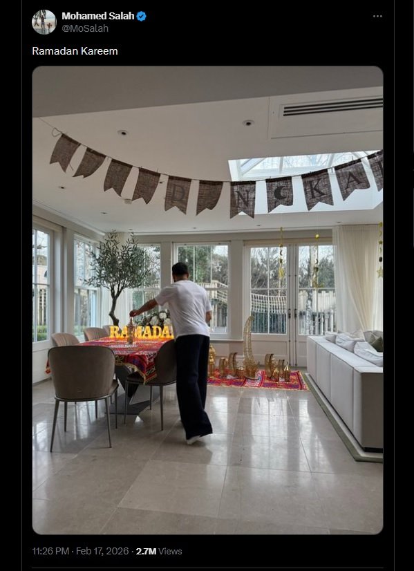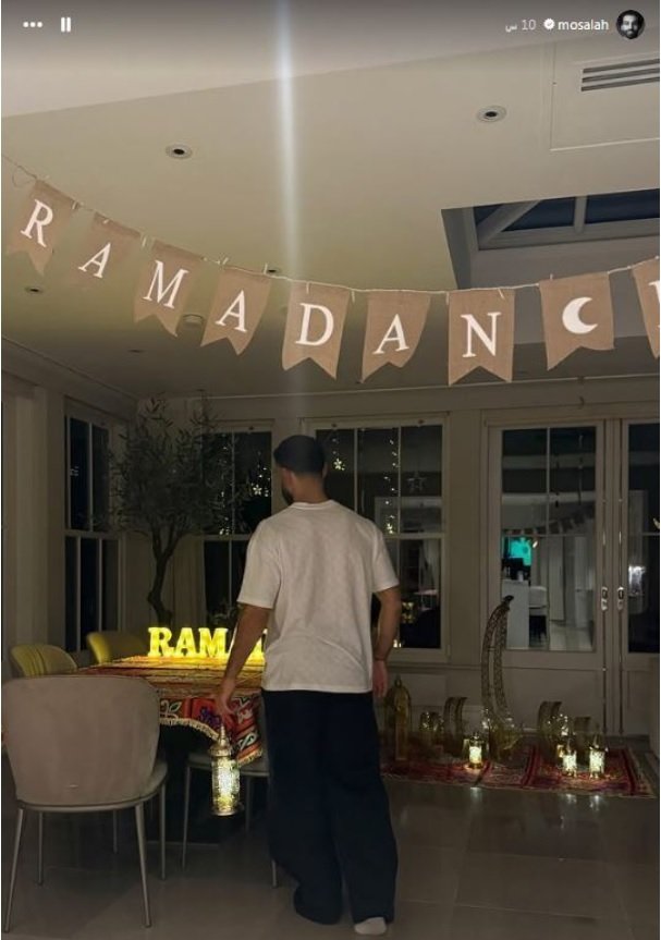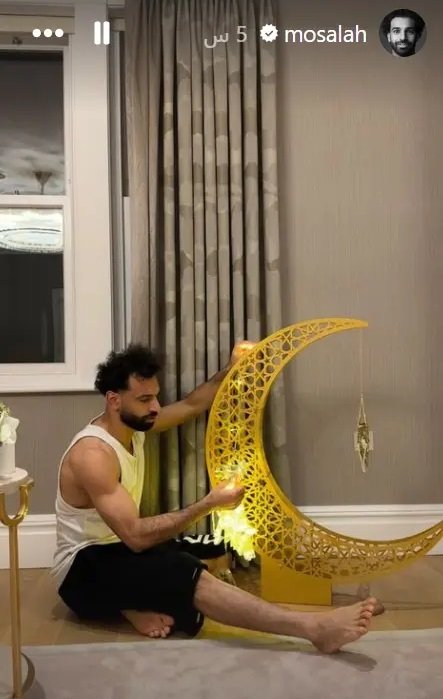 به گزارش روسیا الیوم، صلاح تصاویری از خود را در حسابهایش در شبکههای اجتماعی منتشر کرد که در آن داخل منزلش، در میان تزیینات و فانوسهای ماه رمضان دیده میشود. او تنها به نوشتن عبارت «رمضان کریم» اکتفا کرد.