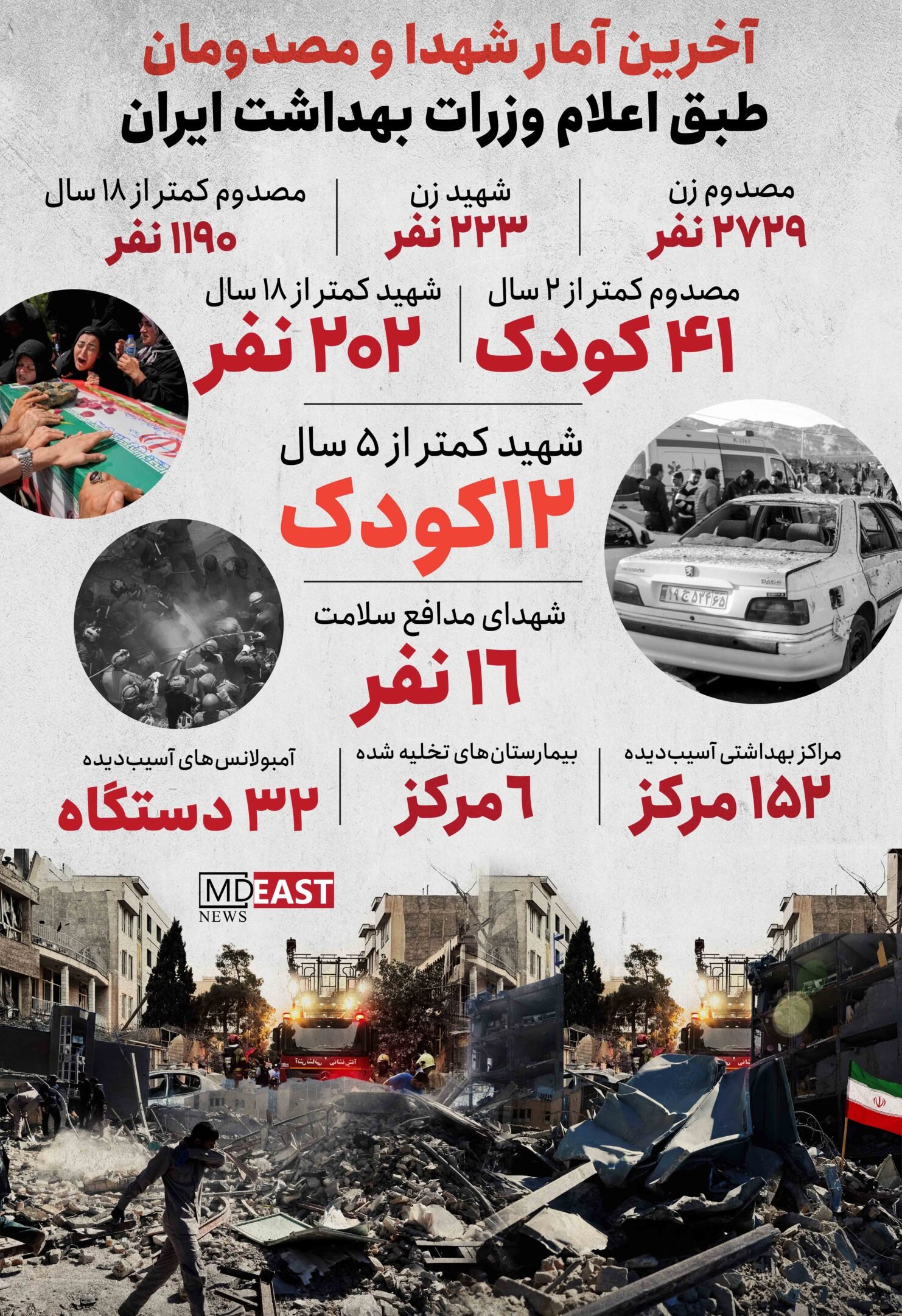 وزارت بهداشت ایران آخرین آمار شهدا و مصدومان ایرانی بر اثر حملات آمریکا و رژیم صهیونیستی را به تفاصیل اعلام کرد.