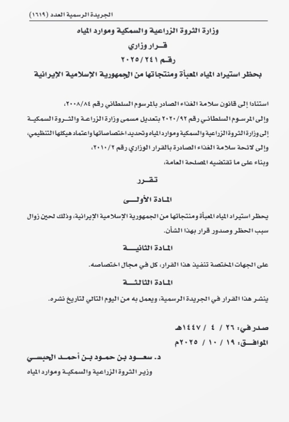 ميدل ايست نيوز: أصدرت وزارة العدل والشؤون القانونية في سلطنة عمان هذا اليوم الأحد الموافق 26/10/2025 العدد (1619) من الجريدة الرسمية، وتضمن العدد على قرار وزاري من وزارة الثروة الزراعية والسمكية وموارد المياه رقـم 241/2025 بحظر استيراد المياه المعبأة ومنتجاتها من الجمهورية الإسلامية الإيرانية.