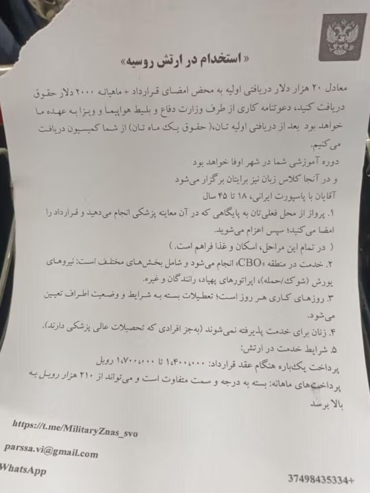 وبحسب الصورة المنشورة لهذا «الإعلان» على مواقع التواصل الاجتماعي، فإن معدّي النص دعوا على ما يبدو رجالاً إيرانيين من الشباب ومتوسطي العمر للانضمام إلى الجيش الروسي مقابل مبلغ مالي وراتب شهري، لإرسالهم إلى مناطق القتال مع أوكرانيا.