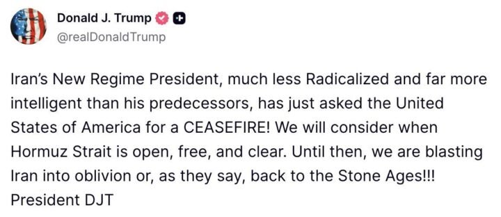 وأوضح ترمب عبر منشور في منصة “نتروث سوشيال” أن بلاده ستنظر في مسألة وقف إطلاق النار عندما يكون مضيق هرمز مفتوحاً وحراً للملاحة، مضيفاً: سنواصل ضرب إيران حتى يتم فتح المضيق.