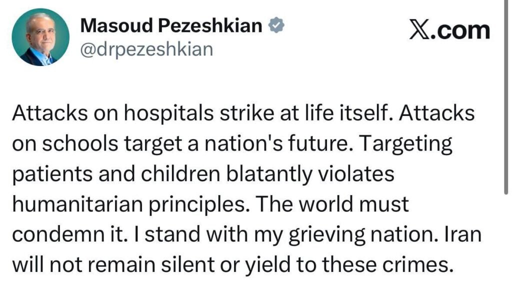 بر اساس بیانیه منتشر شده در کانال اخبار ریاست جمهوری ایران، پزشکیان نوشت: هدف قرار دادن بیماران و کودکان آشکارا اصول انسانی را نقض میکند.